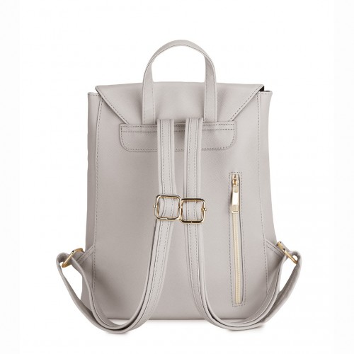The main compartment uses a drawstring closure under a stylish flap adorned with a glossy metal detail. A magnetic snap on the flap adds an extra layer of security.