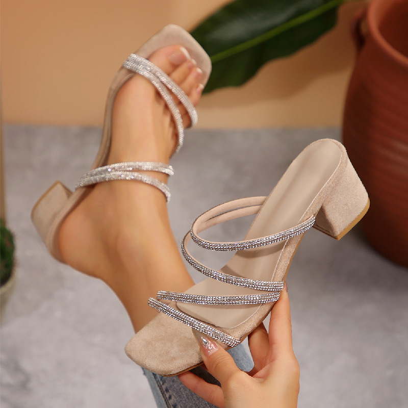 Chunky Heel Rhinestone Thin Strap Mid Heel Sandals Women Two Way Square Toe Slippers