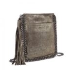 A stylish shoulder bag with a tassel ornament, metal chain as shoulder strap and around the bag.