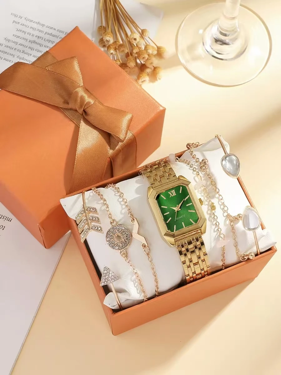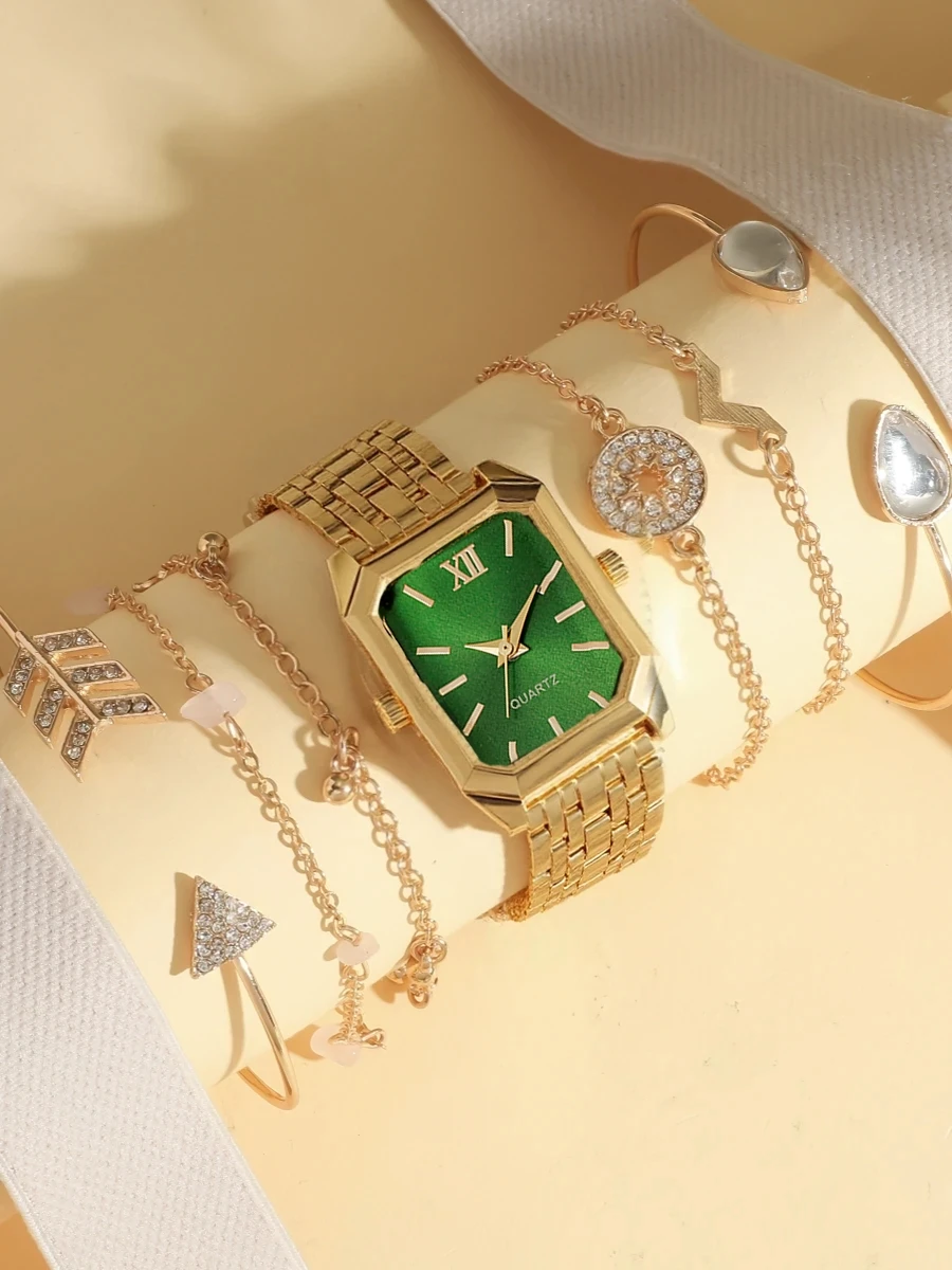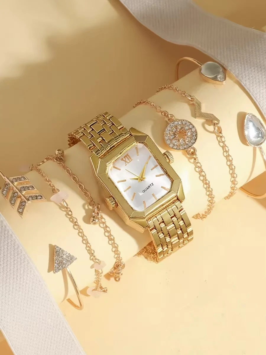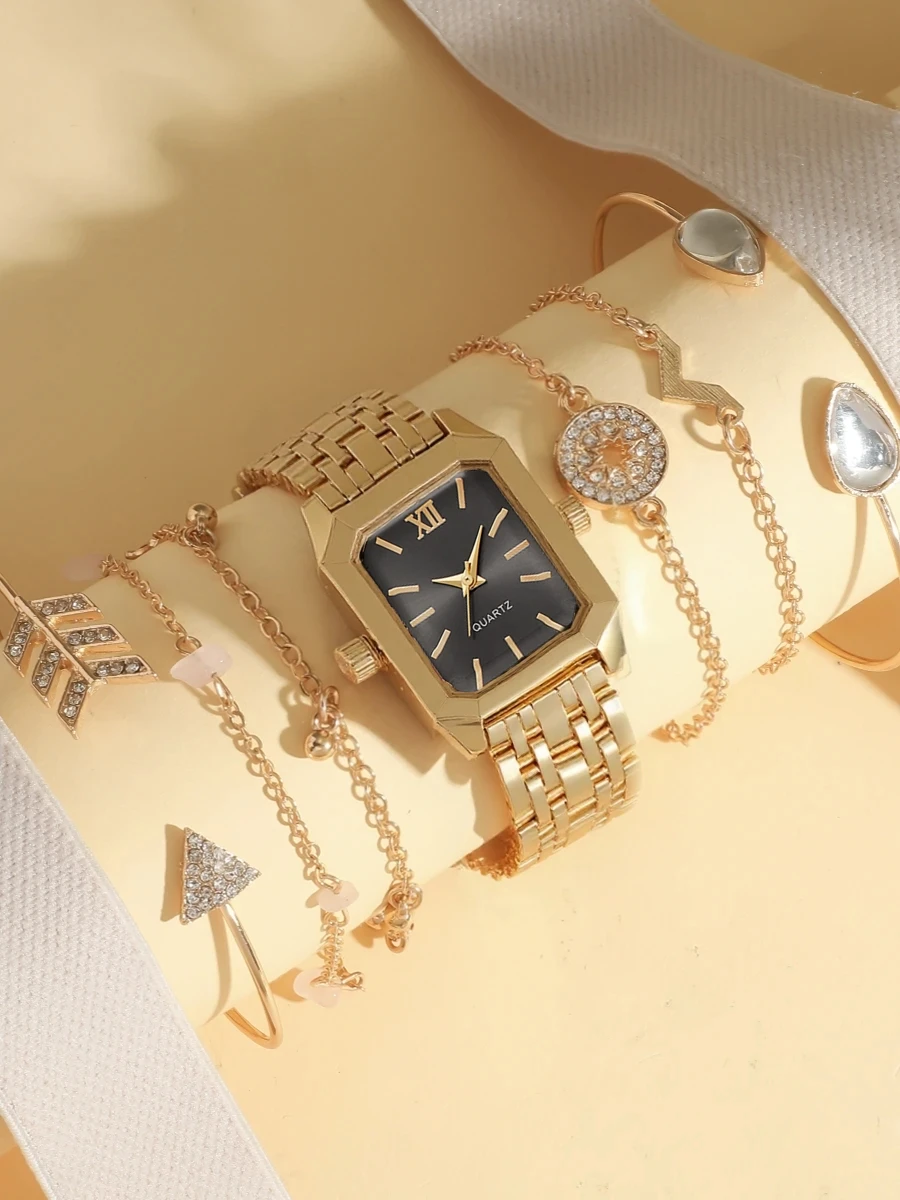 Fashionable, simple, versatile steel band square dial women’s quartz watch bracelet set of 7, suitable for Christmas and Thanksgiving