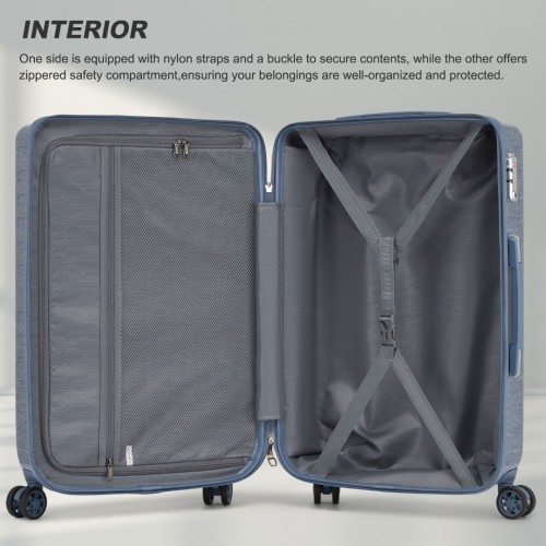 The interior of this suitcase is thoughtfully designed to keep your belongings organized. It features adjustable nylon straps and a zippered closure to secure your items in place. Additionally, a zippered mesh pocket is perfect for storing smaller essentials, keeping everything neat and easily accessible.