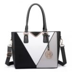 Fashionably structured with a leather look and color-block design, this shoulder bag stands out in style.