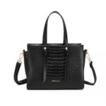 A simple handbag covered with crocodile pattern. The detachable and adjustable shoulder strap allows you to use this bag as a tote or a cross-body bag.