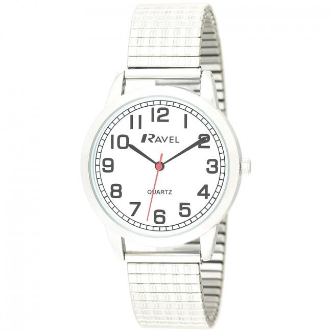 All Ravel expander watches are fitted with crown stoppers to protect battery life and are packed in a clear Ravel hanging pouch with guarantee card. Polished Round Case. Full Super Bold Arabic Dial. Super Bold Easy Read Hands Slimline Soft Comfort Fit Expander Bracelet.