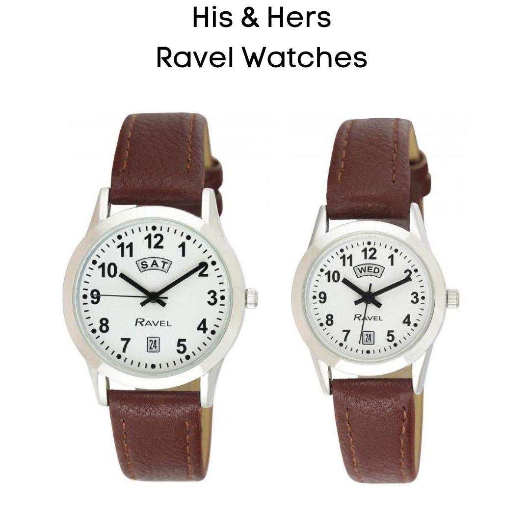 Ravel Gents Gilt Day/Date Brown Faux Leather Strap Watch + Ravel Ladies Gilt Day/Date Brown Faux Leather Strap Watch