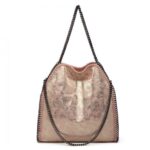 Gunmetal chain woven into the border of the bag, turning into the handles at the top of the bag