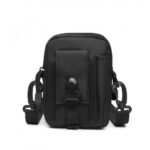 Two front pockets one open top pocket and one accessed via a side release plastic buckle