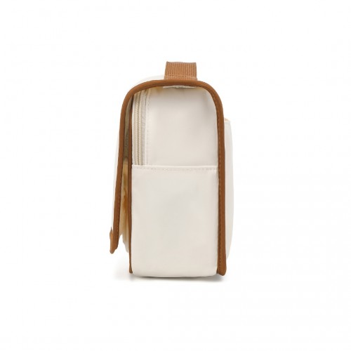 A main zippered compartment on the lower section, designed with a U-shaped zipper for easy access. The zipper pull is a round metal piece, offering a comfortable grip. Inside, there’s an elastic band sewn into three sections at the back, ideal for holding skincare products and ensuring they stay in place.