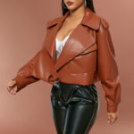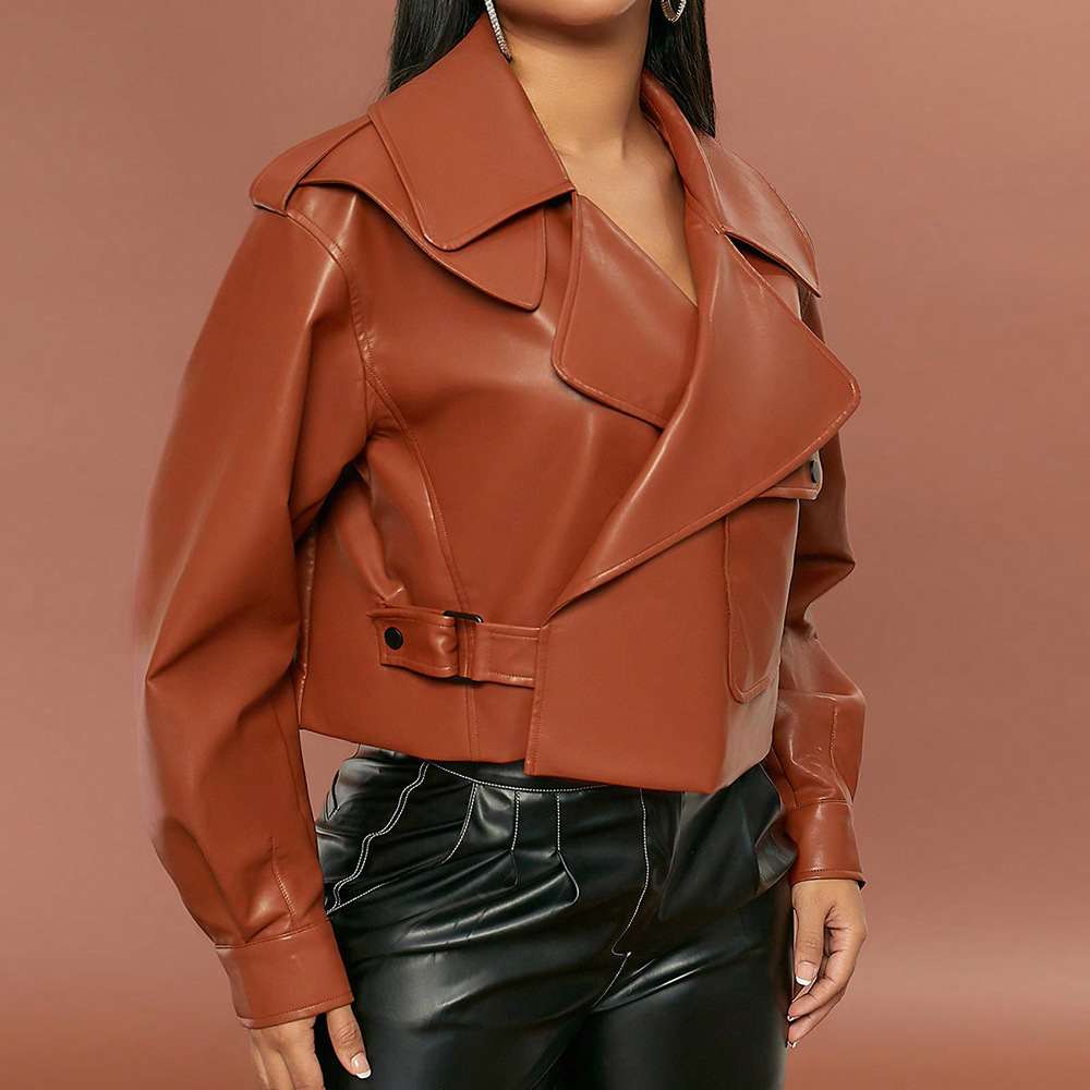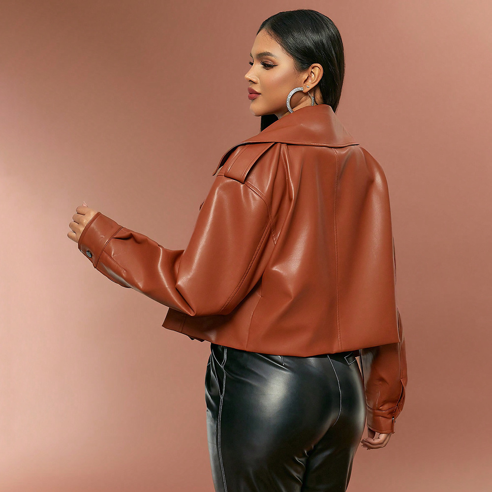 Home » Shop » Spring Autumn Women Faux Leather Jacket Solid Color Collared Long Sleeve Leather Jacket