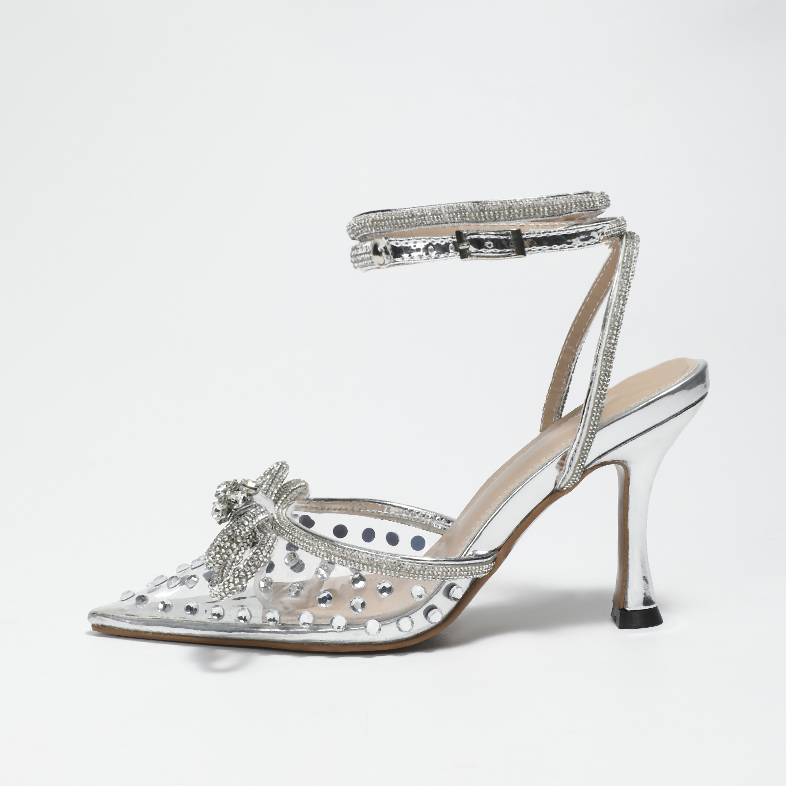 Summer Transparent Pink Stiletto 8.5cm Pointed Toe Rhinestone Heels Bowknot Women Shoes